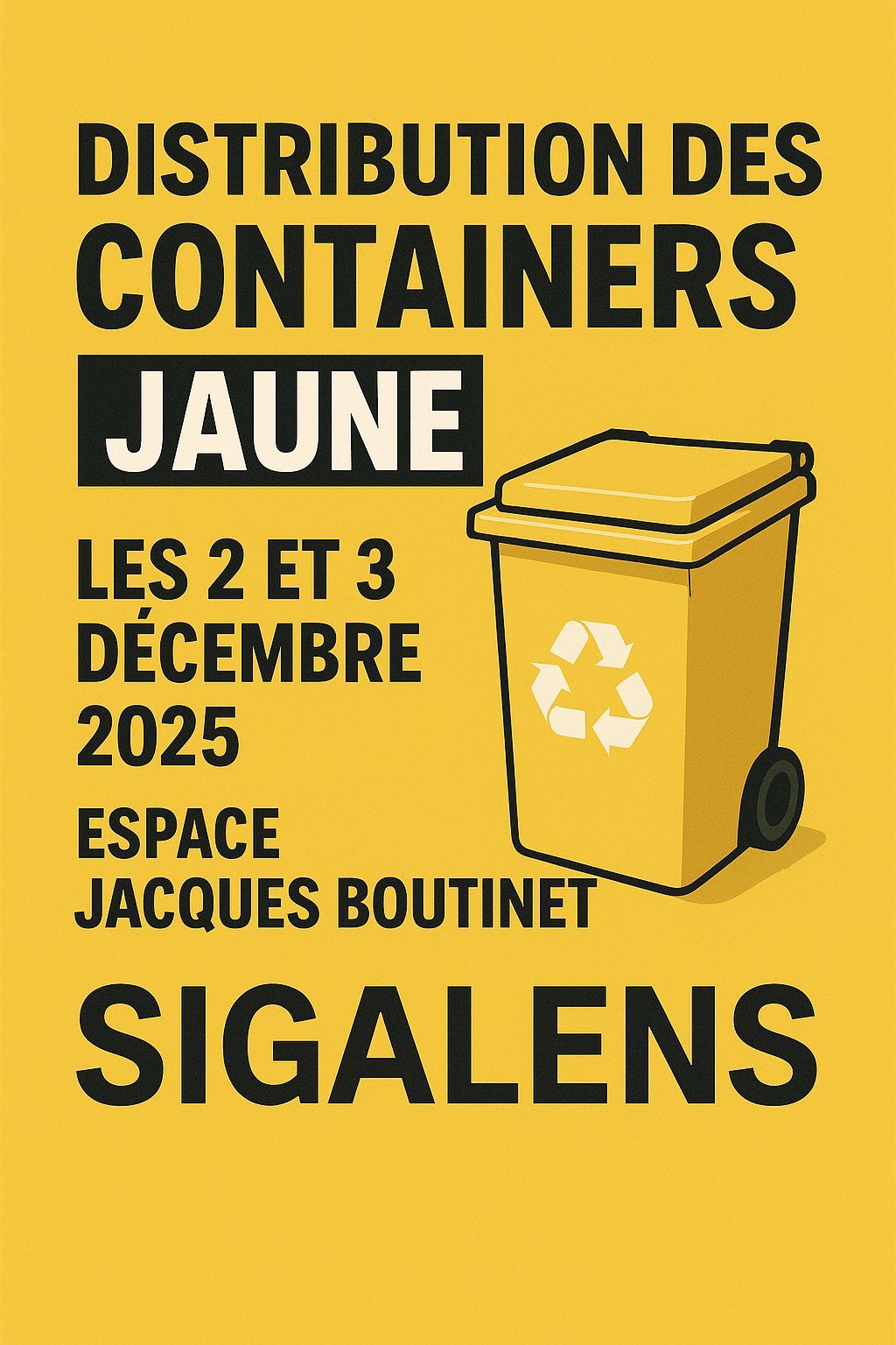 Les bacs individuels de tri sélectif seront disponibles à l'espace J. Boutinet les 2 et 3 décembre 2025. Chaque abonné recevra bientôt une invitation à retirer son bac. ATTENTION Au delà de ces dates les bacs seront remis au dépôt du SICTOM il vous faudra aller le chercher par vos propres moyens. Les tournées seront mises en place dè janvier 2026. Une explication de l'organisation de ces dernières vous seront transmises dans le même temps. Alors à vos Bacs !!!!