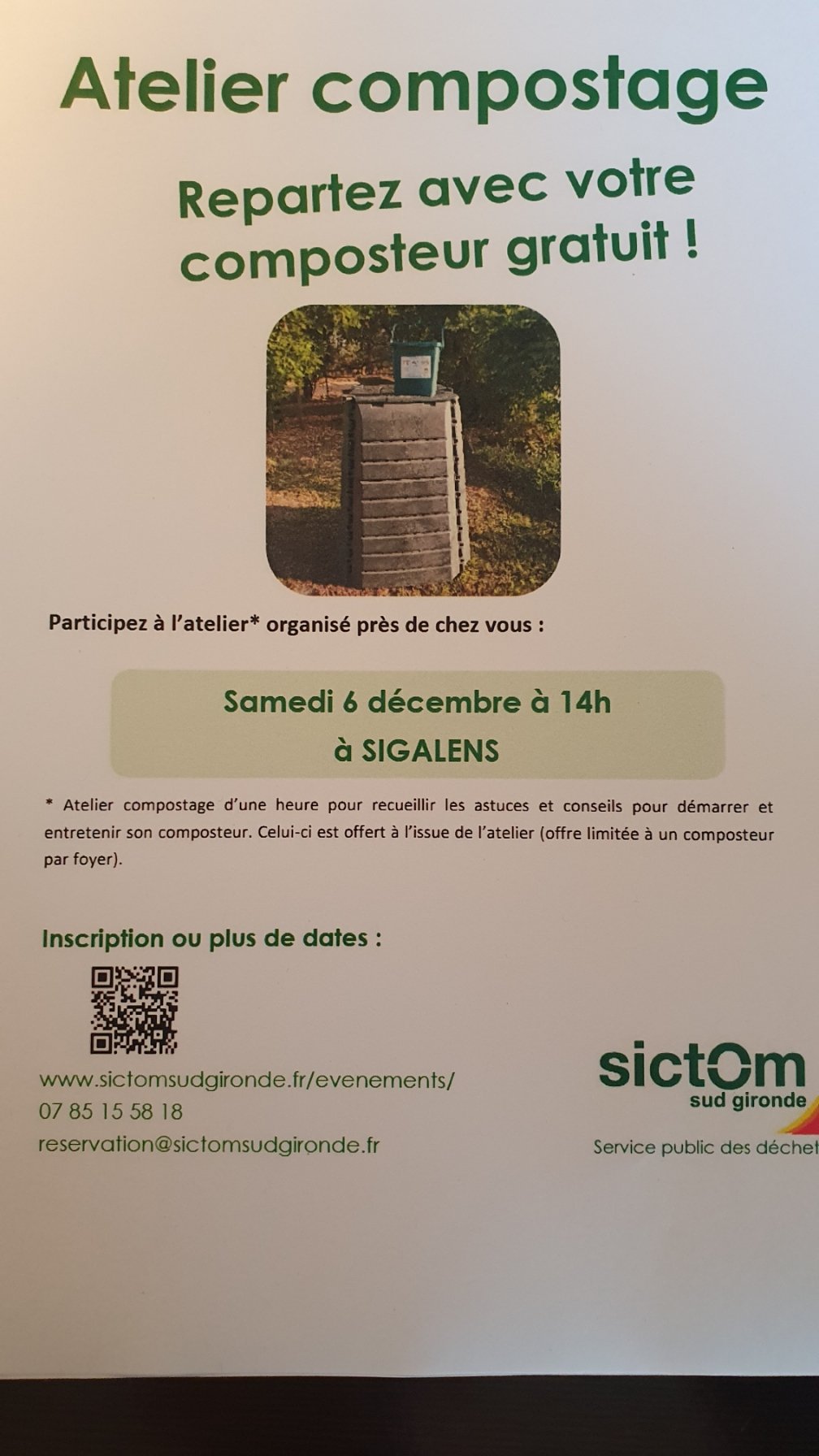 Atelier compostage d'une heure pour recueillir les astuces et conseils pour démarrer et entretenir son composteur. Celui-ci est offert à l'issue de l'atelier ( offre limitée à un composteur par foyer) inscription sur le site www.sictomsudgironde.fr/evenements ou au 07 85 15 58 18