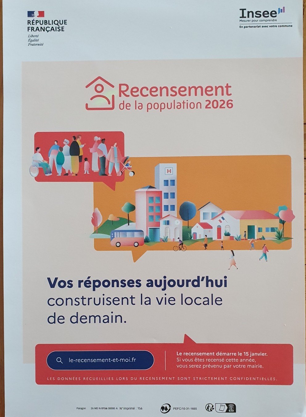 La commune de SIGALENS sera recensée entre le 15 janvier 2026 et le 15 février 2026. Merci à toutes et tous pour l'accueil que vous réserverez à notre agent recenseur.