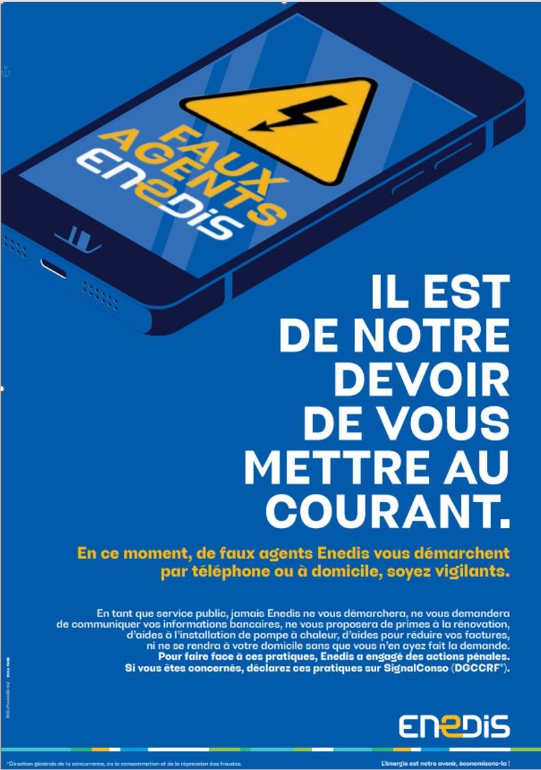 Jamais ENEDIS ne vous démarchera, ne vous demandera de communiquer vos informations bancaires, ne vous proposera de primes à la rénovation, d'aides à l'installation de pompe à chaleur, d'aides pour réduire vos factures, ni ne se rendra à votre domicile sans que vous n'en ayez fait la demande.